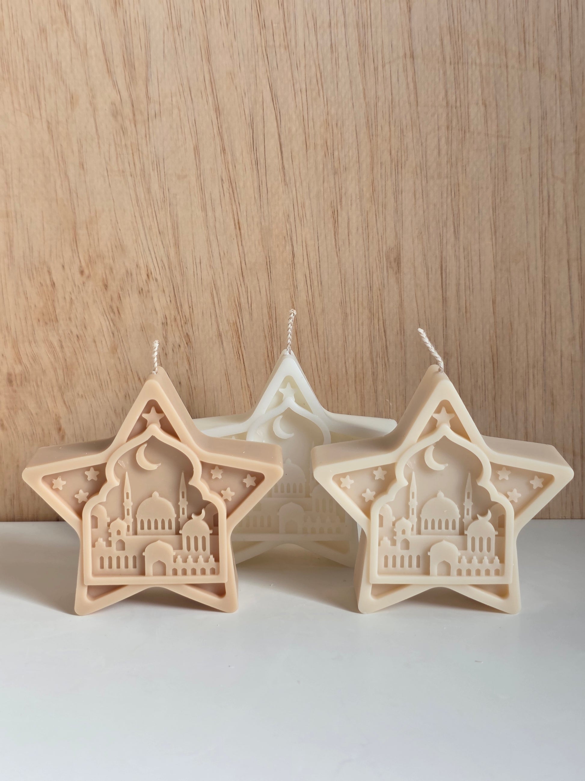 Each piece features intricate Islamic-inspired details from crescent moons and stars to mosque silhouettes and ornamental patterns making every candle a decorative statement as much as a source of warm light.