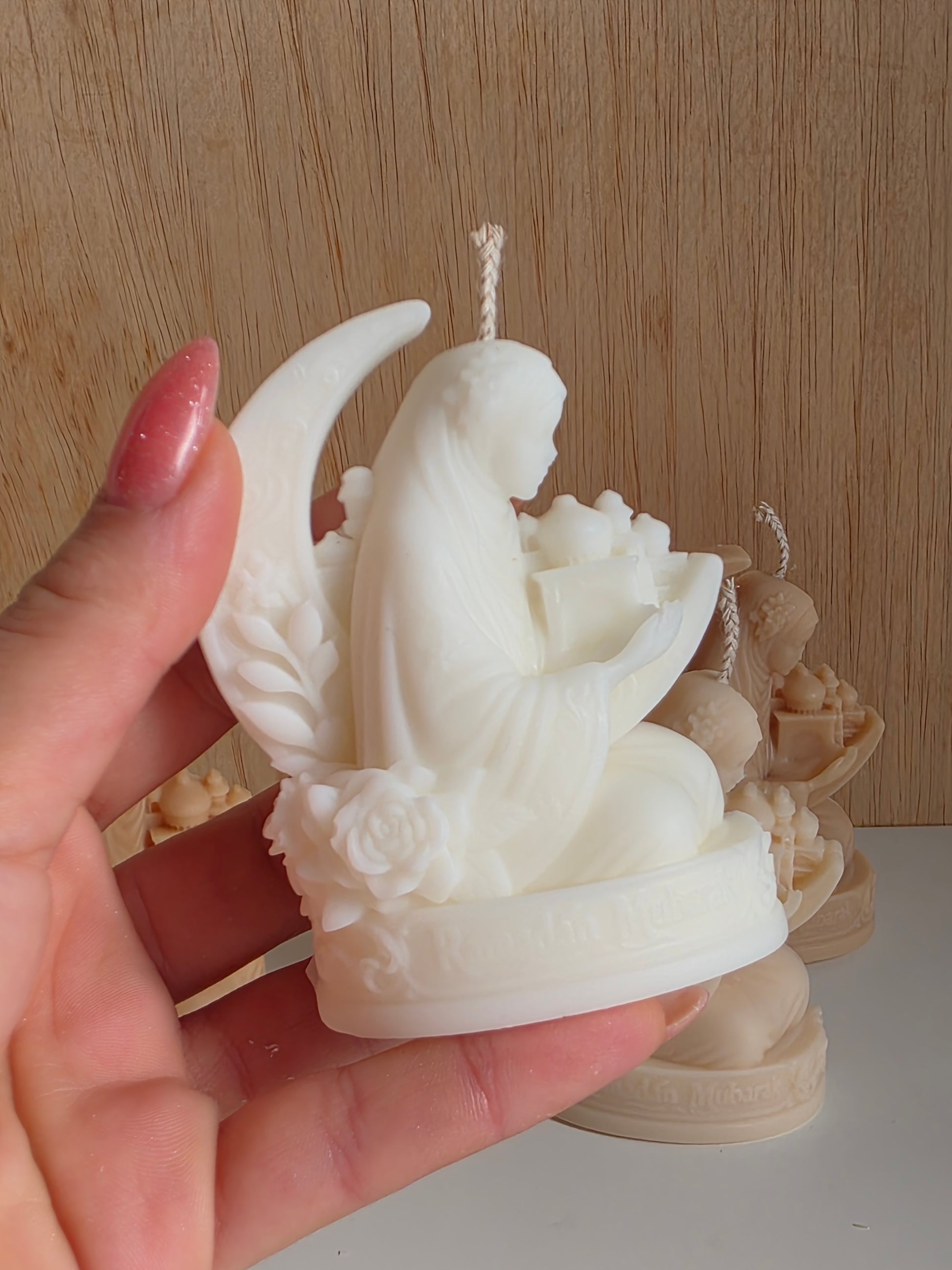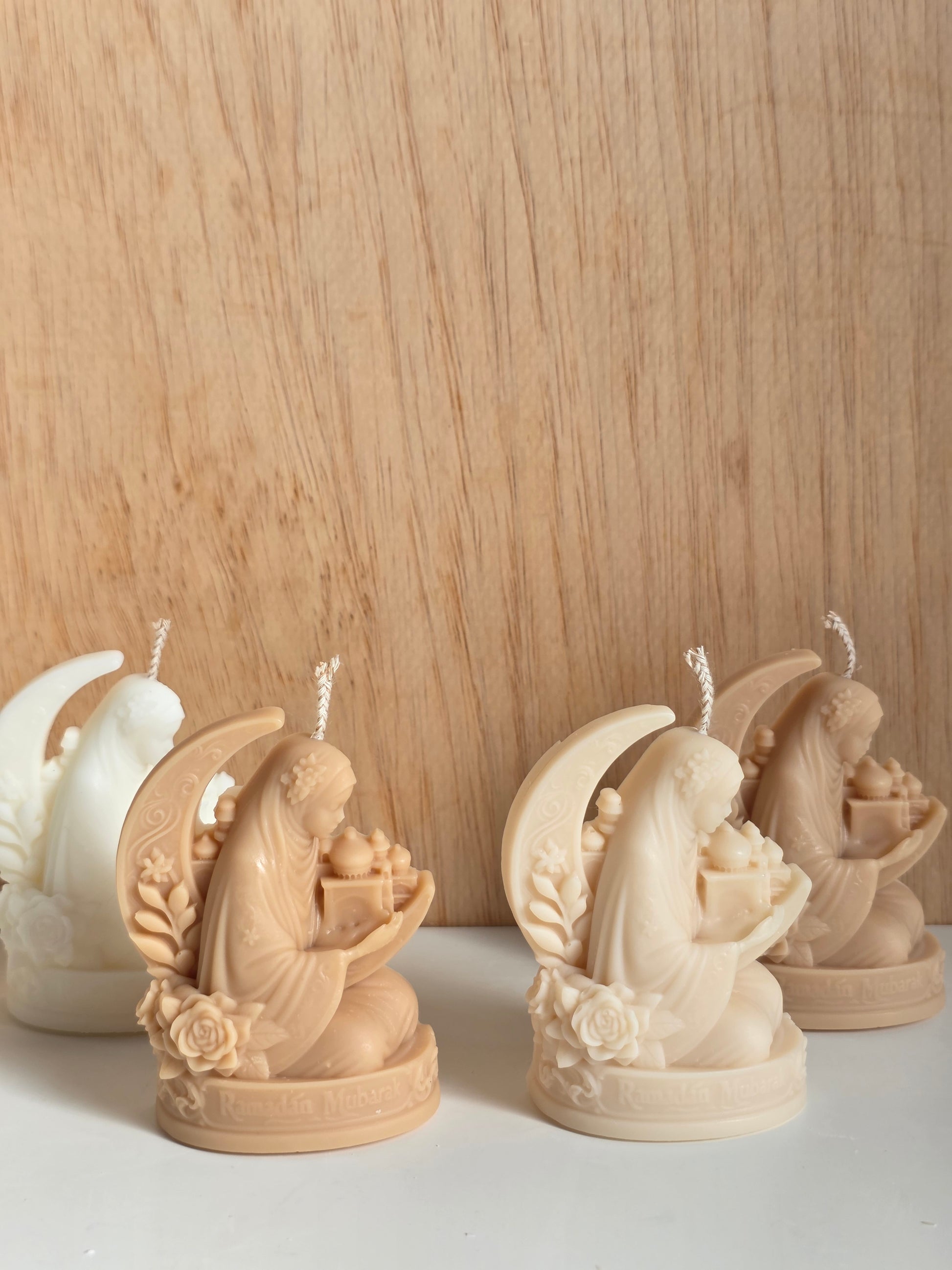 Each piece features intricate Islamic-inspired details from crescent moons and stars to mosque silhouettes and ornamental patterns making every candle a decorative statement as much as a source of warm light.