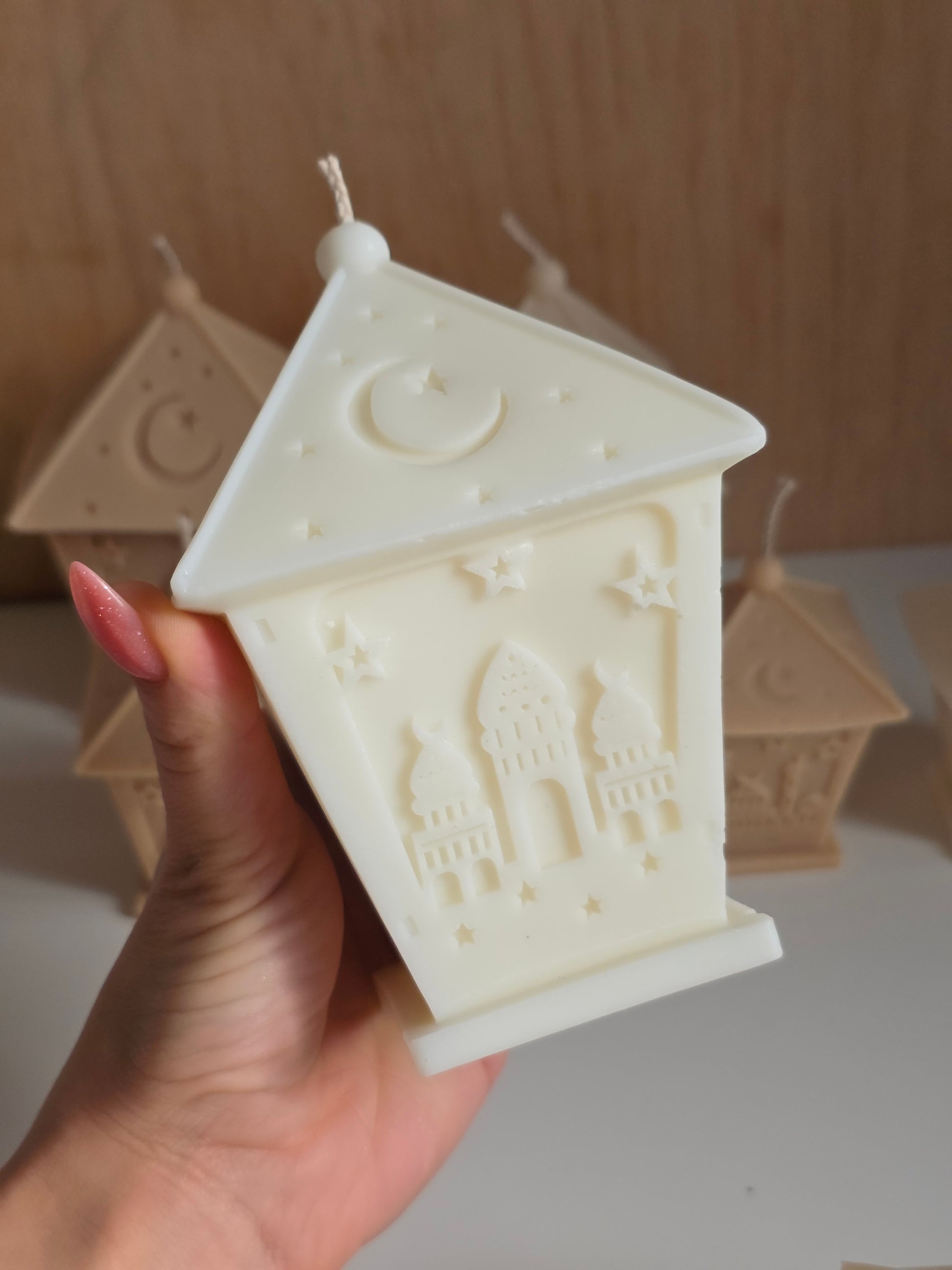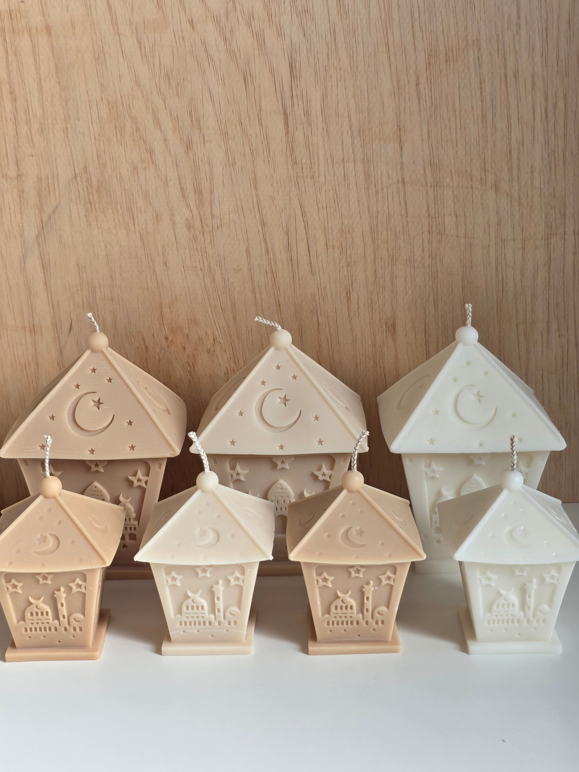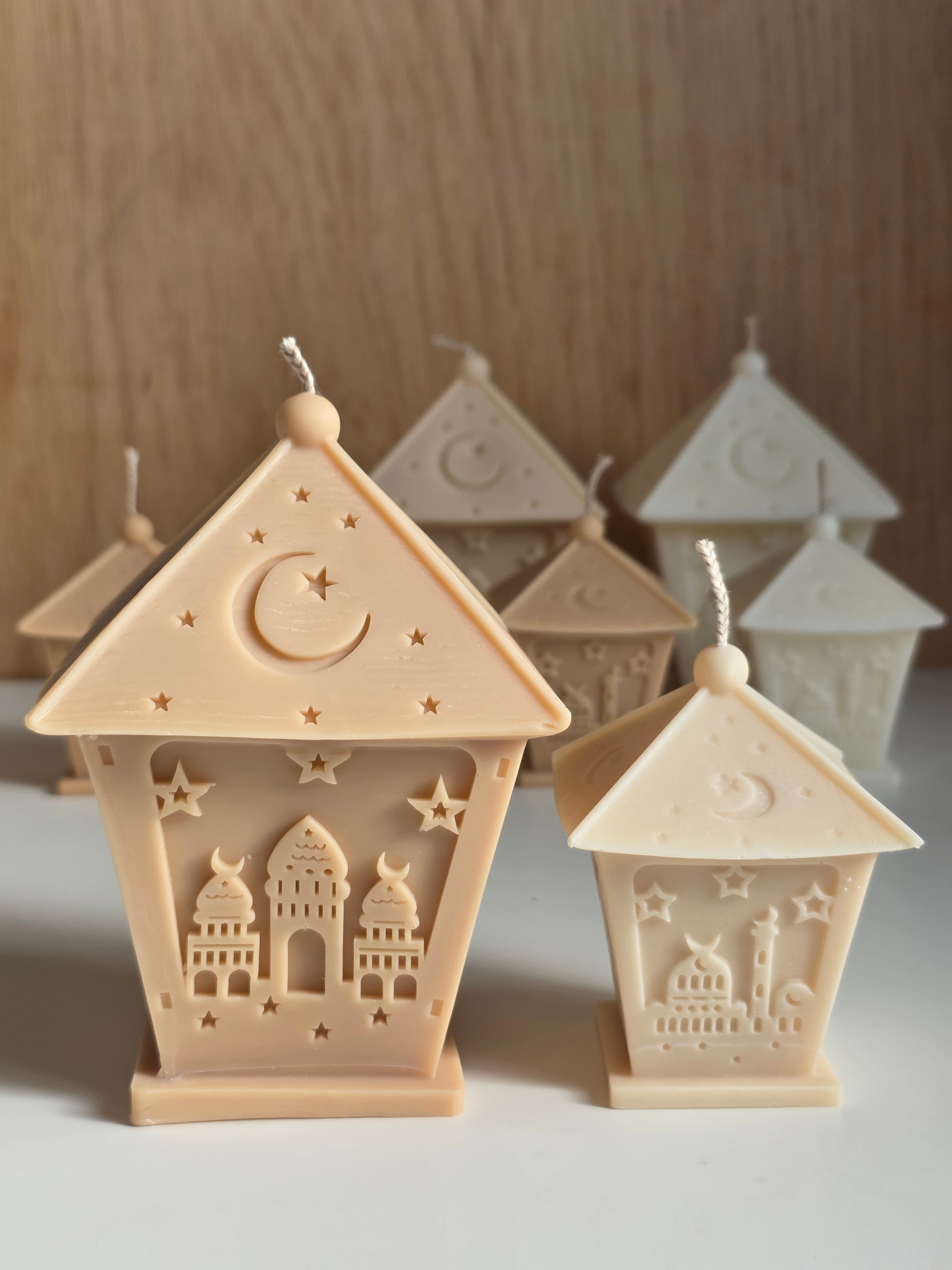 Each piece features intricate Islamic-inspired details from crescent moons and stars to mosque silhouettes and ornamental patterns making every candle a decorative statement as much as a source of warm light.
